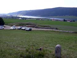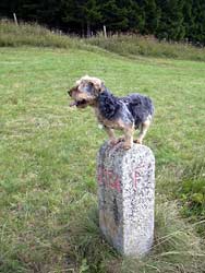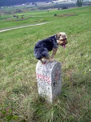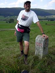 on descend, on descend, c'est raide et en bas une borne, la borne 213, délimitant la frontière, S comme Suisse et le côter F comme France... |