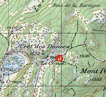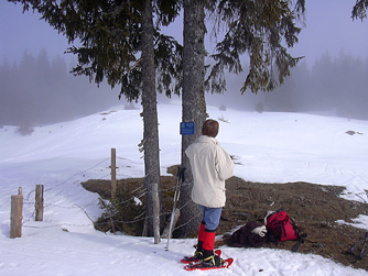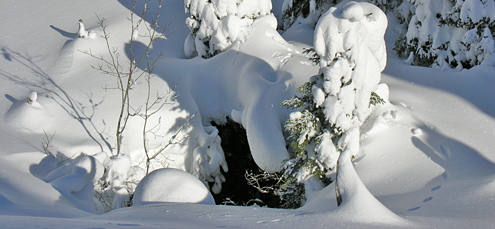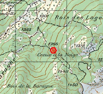 Nous avons découvert ce trou pour la première fois durant une rando en raquettes en pleine tempête de neige. Les piquets de barrière dépassaient de quelques centimètres la couche de neige ce qui éveilla notre attention.